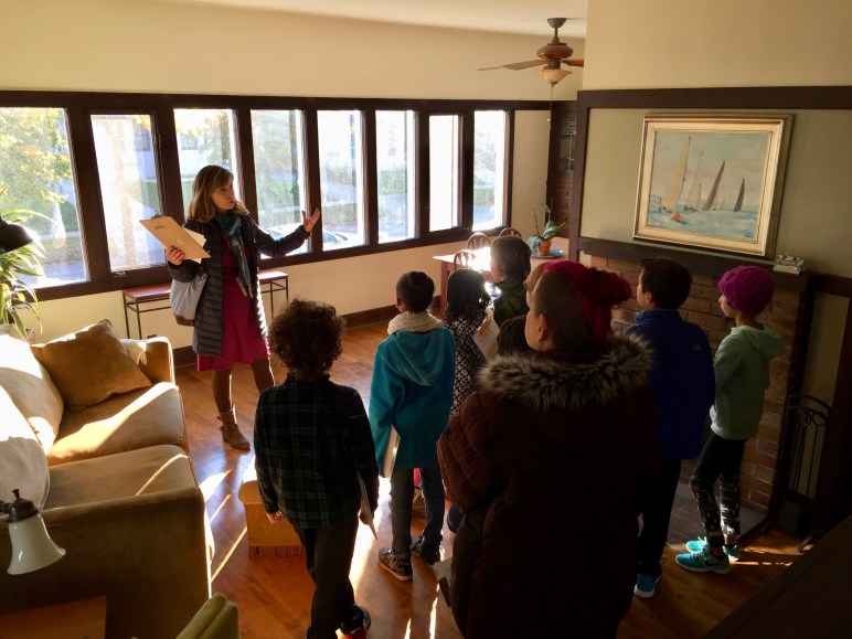 So most afternoons this week, students, teachers and parent chaperones have taken a winding path through Shorewood to find and catalog architectural details like spires and gables, to see nearby houses by Wright’s apprentice Russell Barr-Williamson, and finally, to tour and learn about this Frank Lloyd Wright-designed American System Built House. It’s a privilege to have them visit.