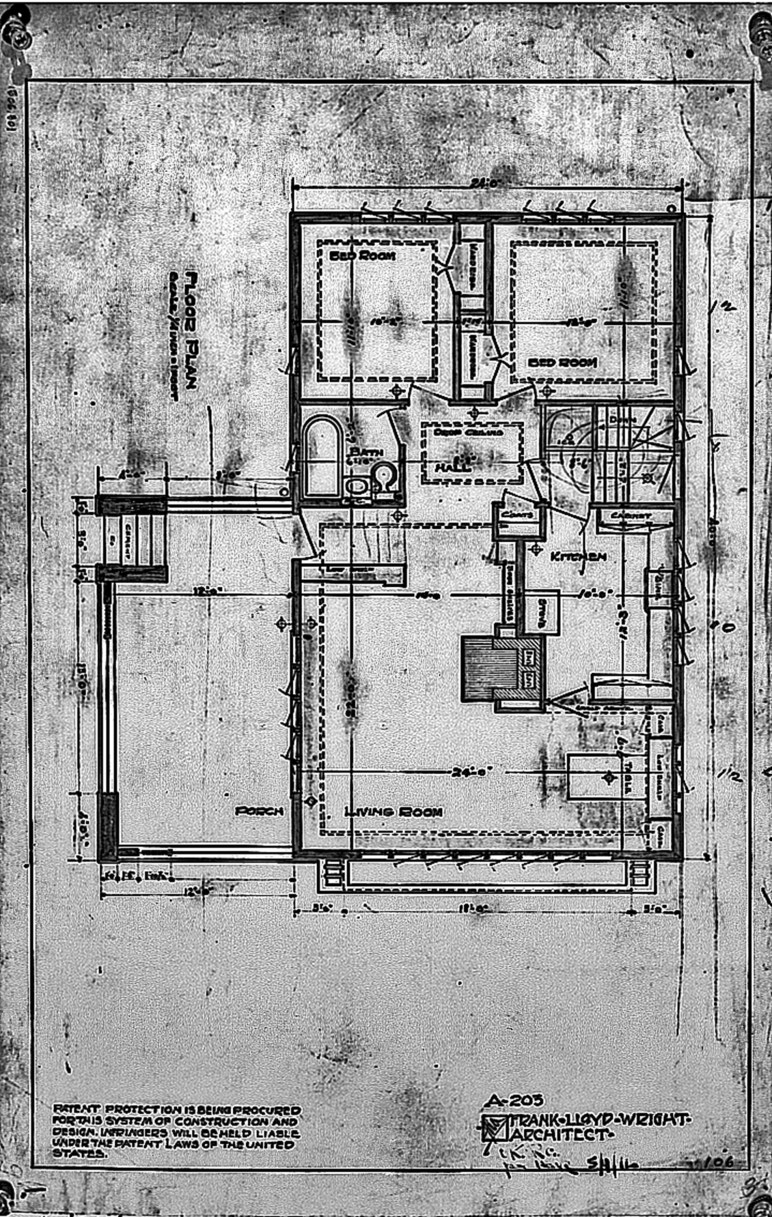 Frank Lloyd Wright’s American System-Built Model A203 (1917-18) is modest: just 960 square feet with two bedrooms and one small bath. But to make the main living space behave much larger, Wright designed an open and flexible floor plan that could be reconfigured for a special occasion, like a holiday party. The original drawings show an “L” shaped Living Room featuring walls of windows all around, a fireplace at the center, and a “breakfast nook” with built in cabinets and shelves and a table and benches that abutted those built-ins. In its drawn position, the table would be a magnet for hungry kids at breakfast time or for a person needing an afternoon coffee break. But when a larger group was to be served, the table could be pulled from the wall, a leaf and three chairs added, and eight or more diners might spread into the space comfortably like a dining hall. It was a bit like reconfiguring a train’s cabin, but on a larger scale.
