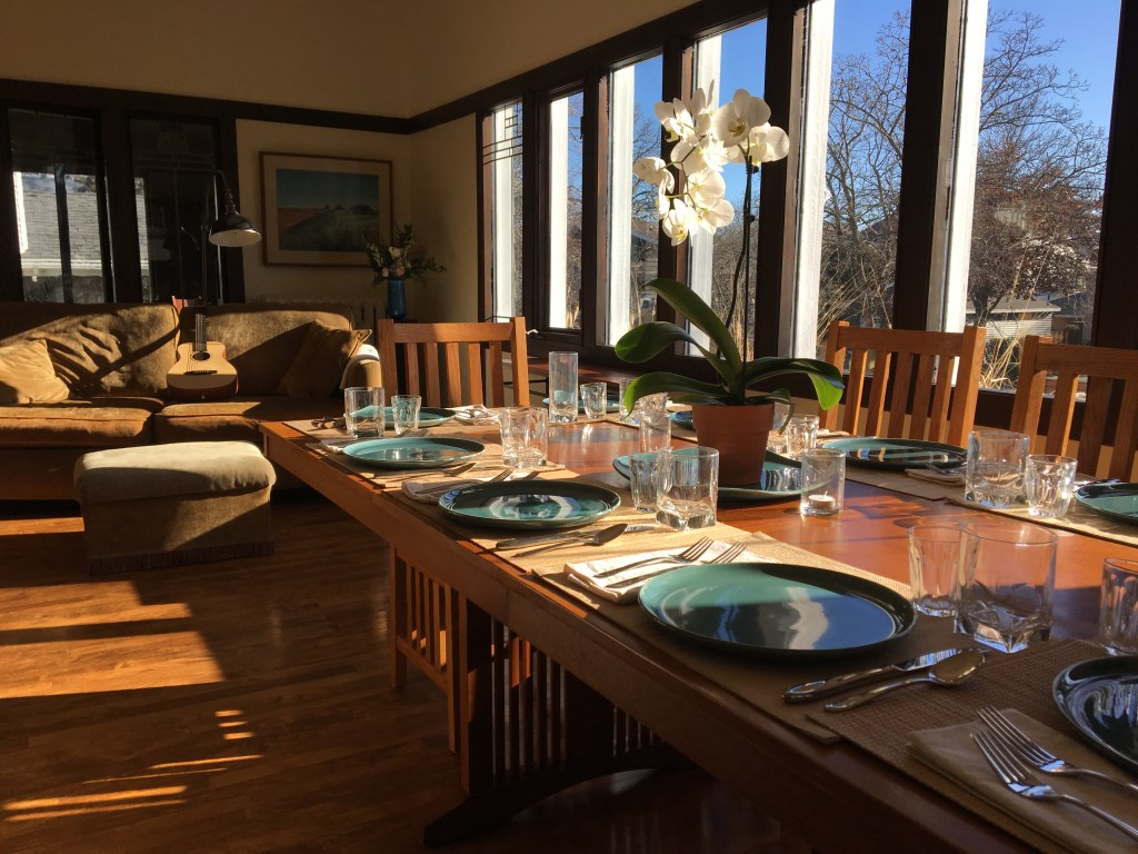 When we arrived in 2016, the breakfast nook had been turned permanently into a conventional dining room: a large table and tall back chairs dominated almost half of the living space, cutting off the flow of foot traffic, and importantly, blocking views to the outside from near the fireplace and from in the kitchen. But the previous owners didn’t know what they were missing, and neither did we at first. We initially put our table in the center of the room too, directly under the light fixture, which was also in the middle of the room. It took a visit by another Wright homeowner to point out our error. She said: