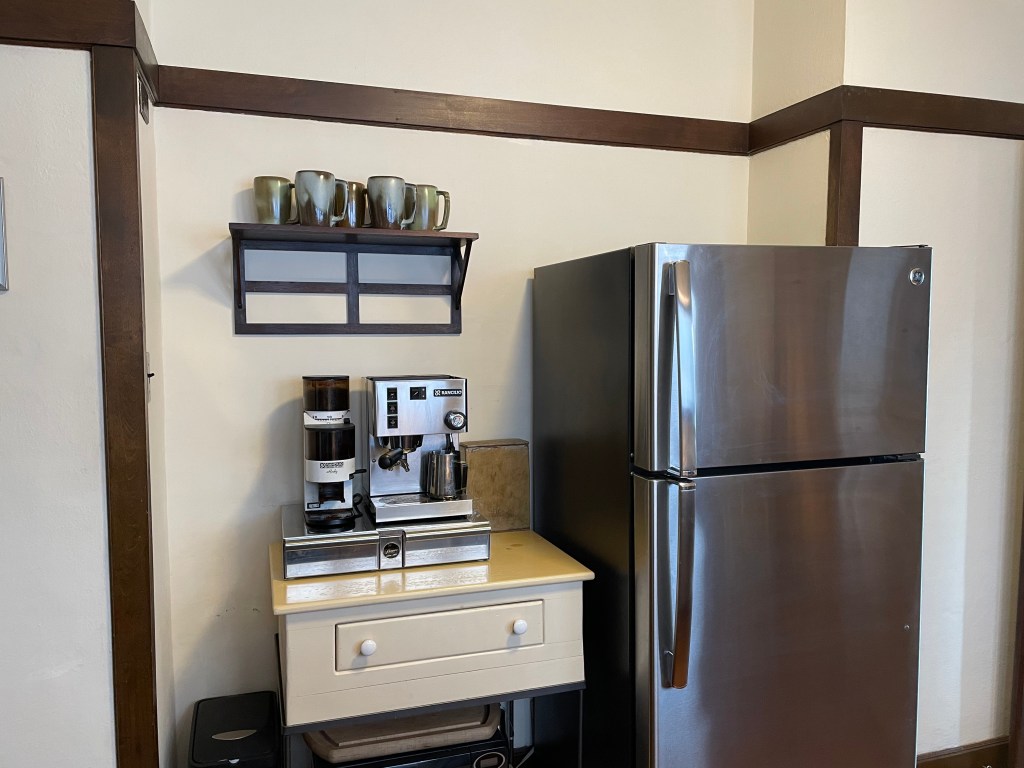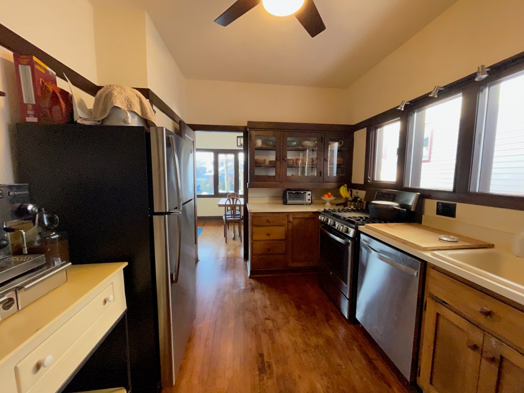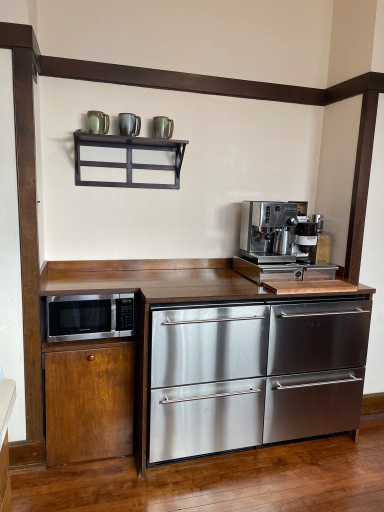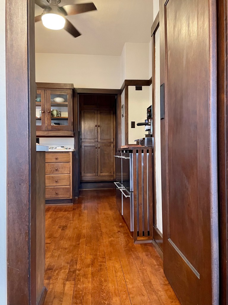 The restored sight-line is multi-purpose, bidirectional and makes social and familial sense: someone working where the stove once was (and where there is now a barista-station) can see into the breakfast nook to converse with or keep tabs on eaters – but also, family seated in the nook can see and share stories with the person making their coffee (or breakfast.) Imagine a couple of kids – one hundred years ago – sitting at the table, back to the warm morning sun, sipping milk while one parent flipped breakfast eggs and the other buttered toast and they all planned the weekend. It’s not only about seeing things, but about living and being together in an American System-Built House.