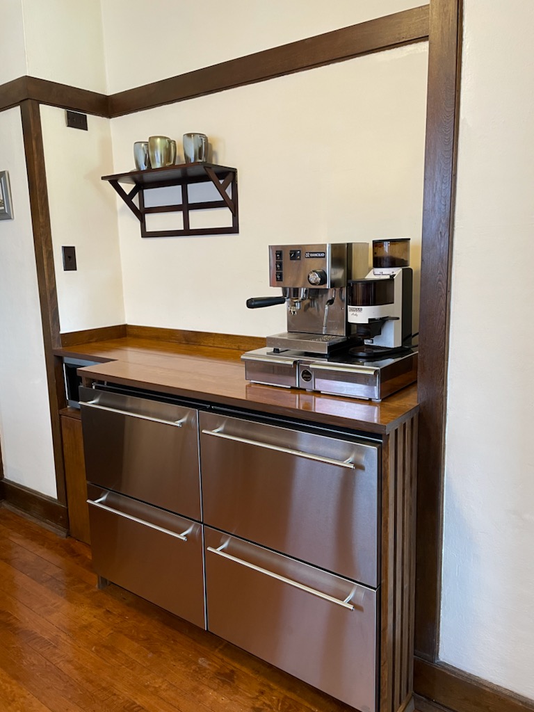 We didn’t expect to have this project completed so quickly, but new appliances arrived 10 days early, so we kicked into high-gear and worked evenings and late nights to get it done. In addition to installing the new equipment, we built a new counter and shelf, a garbage chute and fitted ASBH grills in birch finished with amber shellac to match the rest of the house. The sight-line is clear, but there is more to the story. The benefits of Wright’s original design are social in addition to aesthetic.