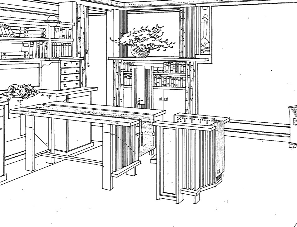 Our evidence: none of the construction sets (drawings in the Avery collection with working plans to build a specific model) show in-situ furniture other than the table, benches, and sometimes a chair. Furthermore, Wright’s ASBH specifications are explicit about what should be supplied, calling out: