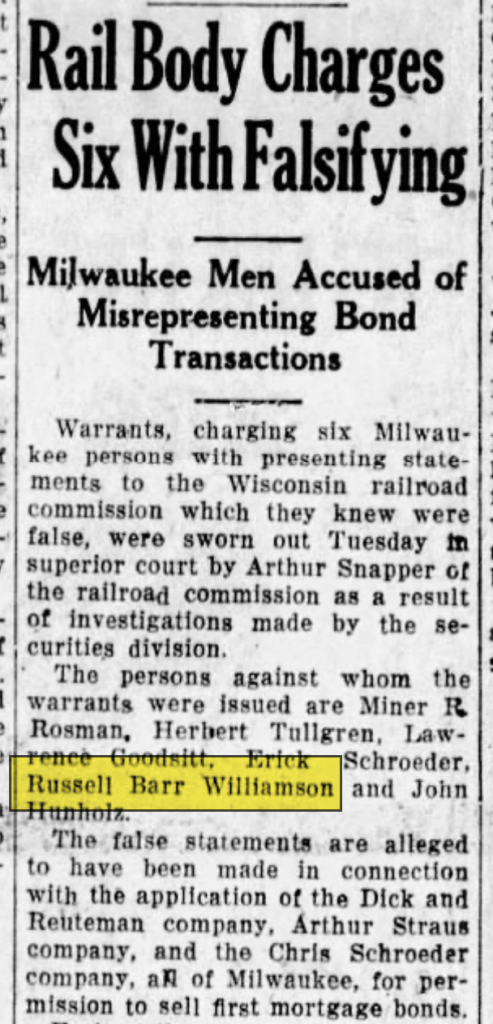 Things began to unravel in July of 1927, when Williamson – along with a cohort of fellow-developers and financiers – was arrested for having “padded” costs to inflate mortgage bond values. It was a sign of over-exuberance in real-estate circles. It was also illegal.